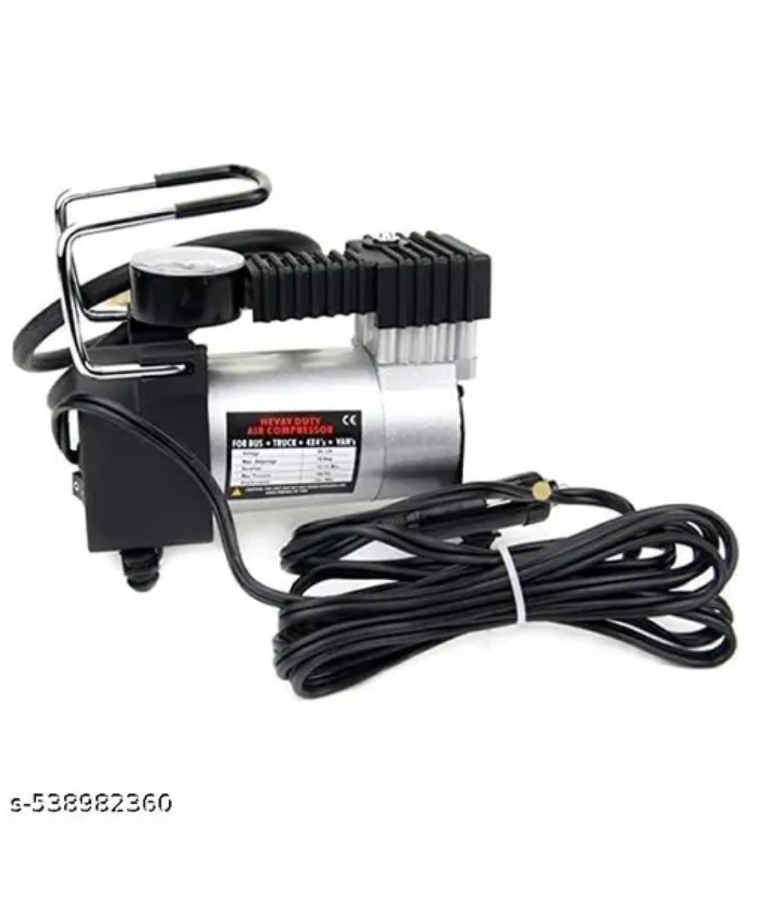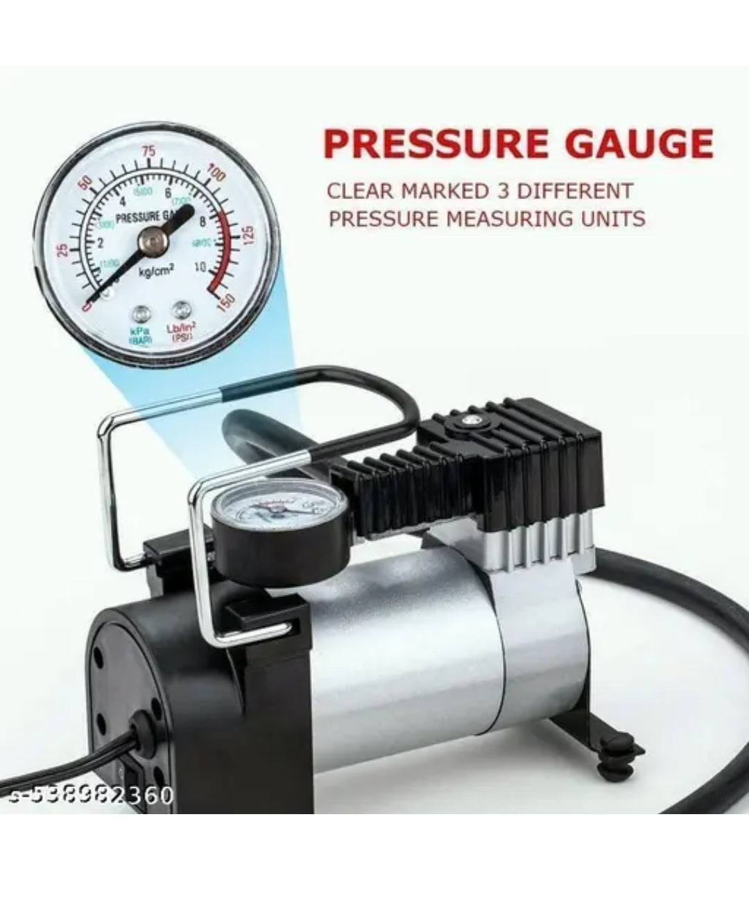 This heavy-duty air compressor pump is engineered for high-performance inflation of tires on buses, trucks, SUVs, and vans. It features a durable metal body with an integrated analog pressure gauge clearly marked in three units—kg/cm², kPa, and PSI—for precise monitoring. The unit supports a maximum pressure of up to 150 PSI, making it ideal for heavy vehicle use. Its stable base, reinforced handle, and high-capacity motor ensure efficient and reliable operation. Perfect for both professional and emergency use, this compressor is a robust solution for all your inflation needs.